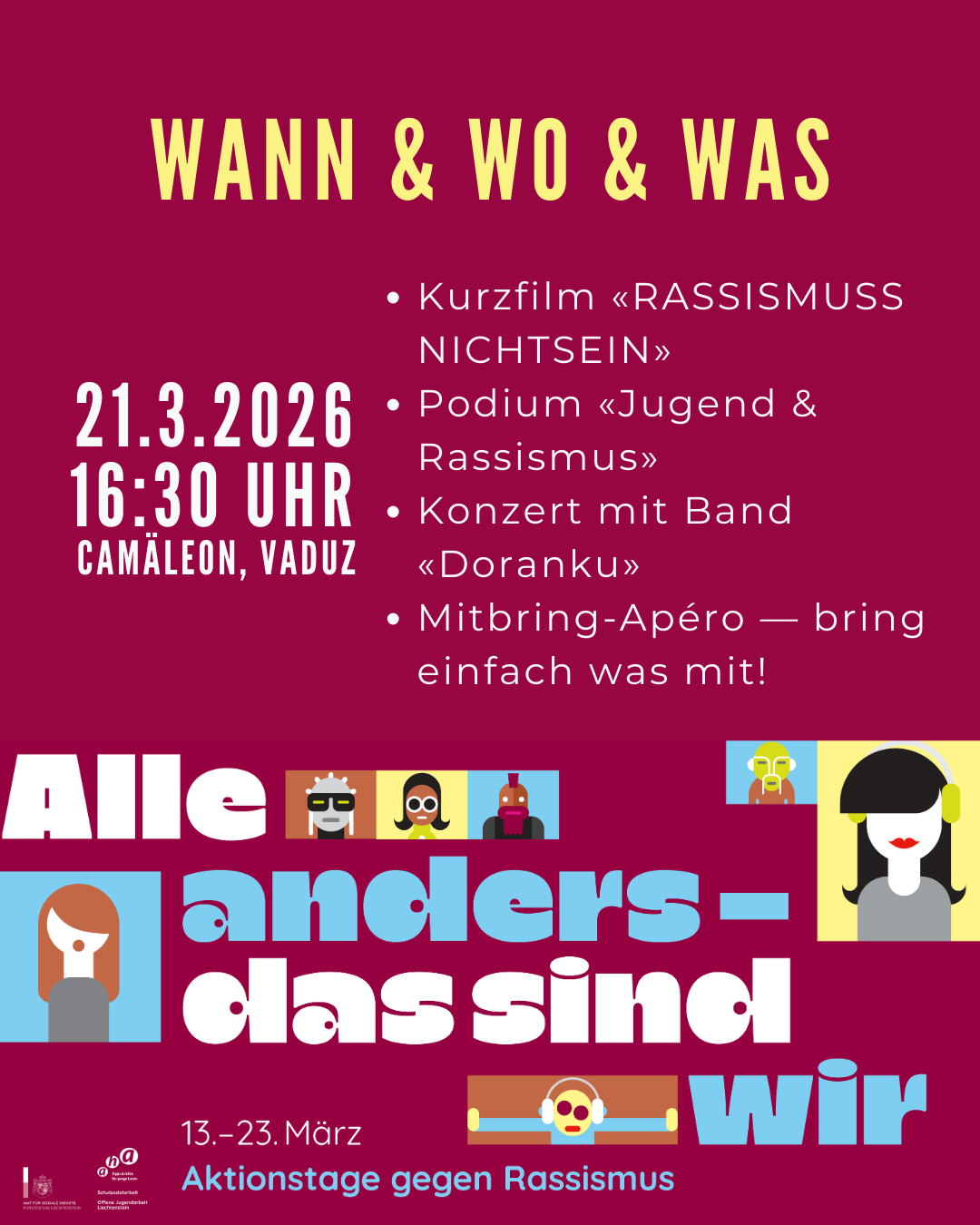 Jedes Jahr am 21. März ist Internationaler Tag gegen Rassismus. In Liechtenstein machen wir dieses Jahr nicht nur einen Tag, sondern gleich zehn Tage daraus. Vom 13. bis 23. März 2026 finden im ganzen Land verschiedene Aktionen statt – in Schulen, Jugendtreffs und bei vielen weiteren Organisationen, die zeigen wollen: Vielfalt ist normal. Was steckt dahinter? 2025 haben die Offene Jugendarbeit (OJA) und die Schulsozialarbeit (SSA) das Projekt «alle anders – das sind wir» gestartet. Fahnen und Banner mit diesem Slogan hingen zehn Tage lang in Schulen und Jugendtreffs – ein sichtbares Zeichen gegen Rassismus und für Vielfalt. 2026 wird das Projekt ausgeweitet. Noch mehr Organisationen und Institutionen machen mit, noch mehr Aktionen finden statt – und alle kommen am 21. März beim grossen Abschlussevent zusammen. Abschlussevent am 21. März ALLE anders – das sind WIR 📅 Samstag, 21. März 2026 · 16:30 bis 19:30 Uhr 📍 Jugendtreff Camäleon, Vaduz 🎟 Eintritt frei · Keine Anmeldung nötig · Offen für alle Der Abend bringt Jugendliche, Fachpersonen und alle Interessierten zusammen – für ehrliche Gespräche, gute Musik und ein gemeinsames Buffet. Das erwartet dich: Rückblick auf die Aktionstage Kurzfilm «RASSISMUSNICHTSEIN» Podiumsgespräch «Jugend & Rassismus» mit Regierungsrat Dr. Emanuel Schädler, Jugendlichen und Fachpersonen Konzert mit der Band Doranku Mitbring-Apéro – bring gerne eine Kleinigkeit fürs gemeinsame Buffet mit! Moderation: Gabriella Alvarez-Hummel Bei Bedarf an Unterstützung (z. B. Gebärdensprachdolmetschen) bitte vorab melden: rahel.schatzmann@llv.li Abschlussevent: Aktionstage gegen Rassismus Bild 3 von 4 Events für Jugendliche Austrodrama Akustik Tour 📅 11. März · 18:30 – 21:00 Uhr · CHF 15–30 👉 backstage.li Kino: «The Old Oak» 📅 19. März · 18:00 – 20:00 Uhr · CHF 5–16 Ein bewegender Film über Begegnung, Würde und Zusammenhalt. 👉 backstage.li Theater: «404 – Happiness not found» 📅 26. & 28. März · 19:00 – 20:30 Uhr · CHF 10–20 👉 backstage.li Alle weiteren Veranstaltungen der Aktionstage findest du im Kalender auf integration.li. Mitmachen Ihr wollt als Organisation ein Zeichen setzen? Dann hängt eine Fahne oder einen Banner auf und organisiert eine kleine Aktion oder Veranstaltung zum Thema. Meldet euch bei uns: rahel.schatzmann@llv.li Weitere ArtikelBlack FridayThemen des jubel-Forum 2019Neujahrsvorsätze(Cyber-)MobbingAnlaufstellenHitzewelle - Do's & Dont's Zuletzt aktualisiert: 03/2026