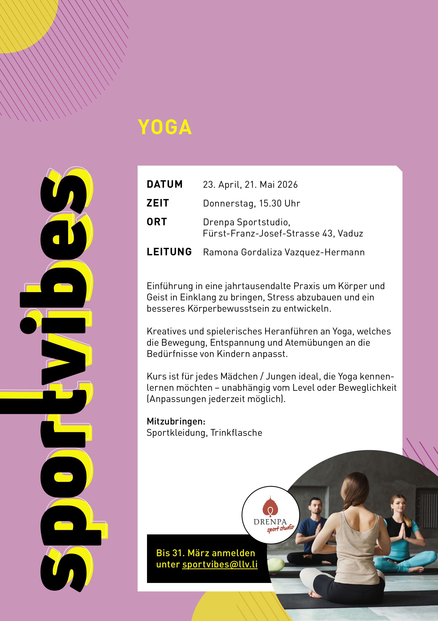 YogaBringe Körper und Geist in Einklang, finde Ruhe und stärke dein Körperbewusstsein. 🧘📅 Donnerstag, 15.45 Uhr | 📍 Drenpa Sportstudio Vaduz