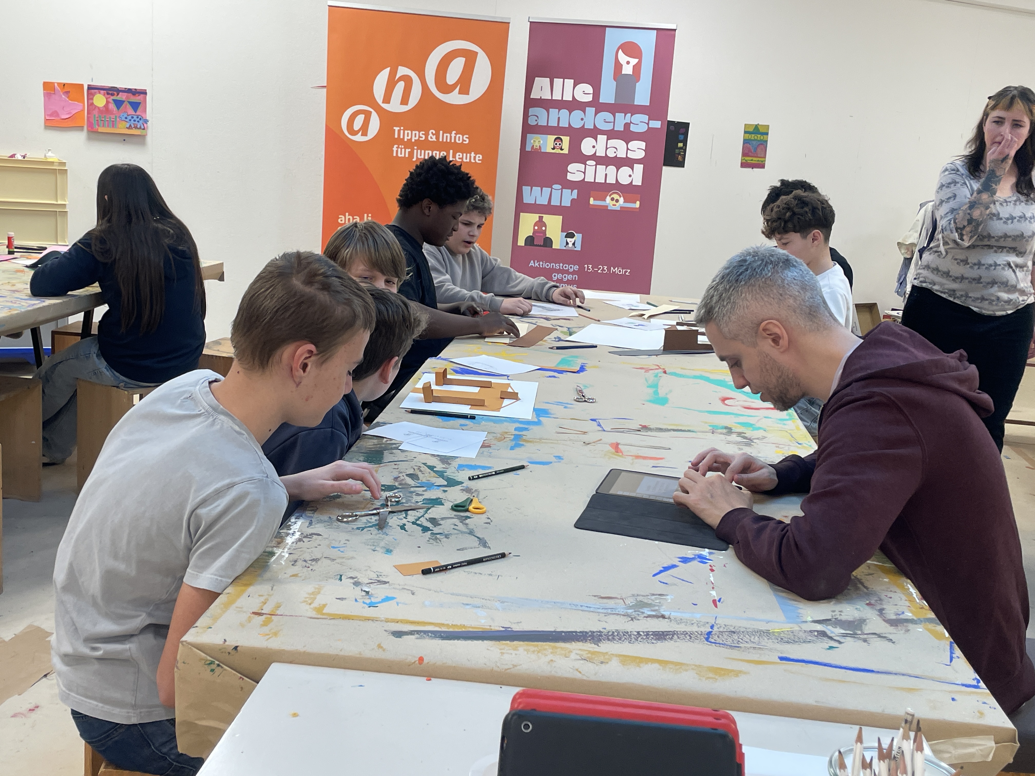 Das aha war ebenfalls Teil der Aktionstage: Am 27. Februar besuchte die Klasse 2c der Oberschule Eschen unter der Leitung von Klassenlehrperson Stephanie Oswald das Kunstmuseum Liechtenstein. Kunstvermittler Simone Fiorillo führte die Jugendlichen in Teile der Ausstellung von Tony Cokes ein, die sich kritisch mit Rassismus auseinandersetzt. Im anschliessenden Workshop arbeiteten die Schüler:innen mit Symbolen für Toleranz und Respekt und tauschten sich über eigene Erfahrungen aus.