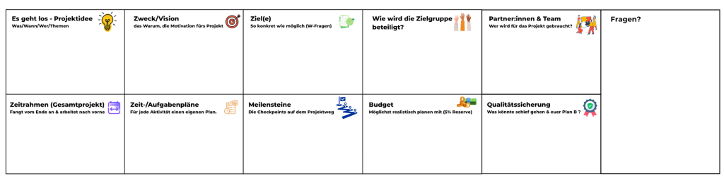 Projekt Canvas Ein Projekt Canvas ist ein Planungstool, das dir hilft, alle wichtigen Schritte in einem Projekt im Auge zu behalten.