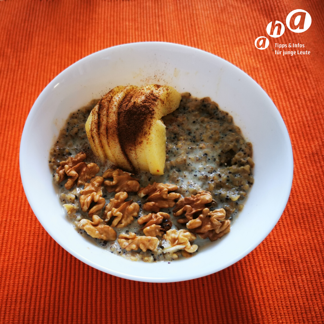 Gestärkt in den Tag starten – am besten mit einem leckeren, selbstgemachten Frühstück. Zutaten (für 1 Person) 6 EL kernige Haferflocken (60 g) 1200 ml Milch 1 Banane 3 TL Mohn (ca. 15 g) Zucker oder Ahornsirup (je nachdem wie süss du es magst) (Zimt, Nüsse, Beeren, …) Zubereitung Schneide ungefähr ein Drittel der Banane in runden Scheiben ab und lege die Stück beiseite. Die restlichen zwei Drittel mit einer Gabel zerdrücken bis die Banane nur noch Mus ist. Jetzt die Milch auf dem Herd erwärmen (sie soll nicht kochen). Haferflocken, zerdrückte Banane und Zucker/Ahornsirup zur Milch geben. Gut schmeckt es auch mit etwas Zimt dazu. Gut durchmischen und eventuell die Temperatur erhöhen – es sollte etwas blubbern. Aber Achtung – Nicht am Boden anhocken lassen! Wenn das Ganze eine cremige Konsistenz hat, noch den Mohn hinzugeben – jetzt ist die Bowl fertig. Jetzt kannst du sie entweder zugedeckt über Nacht auf dem Herd stehen lassen (spätestens am Morgen dann aber in den Kühlschrank stellen), oder gleich essen. Nicht vergessen die Bowl noch schön anzurichten mit den beiseitegestellten Bananenstücken, Nüssen, Beeren – deiner Fantasie sind keine Grenzen gesetzt! AN GUATA! Tipp Am besten schmeckt die Bowl wenn man sie schon am Vorabend macht. Dann wird sie noch saftiger, als wenn man sie frisch kocht. Man kann auch prima vorkochen & die Bowl dann 3-4 Tage im Kühlschrank lassen beziehungsweise jeden Tag eine Portion davon essen. Weitere ArtikelBuchteln mit VanillesauceSuizidZopfbrotHäufige Fragen: Liebe und SexualitätSucht - ÜbersichtBio, regional und nachhaltig Zuletzt aktualisiert: 09/2023
