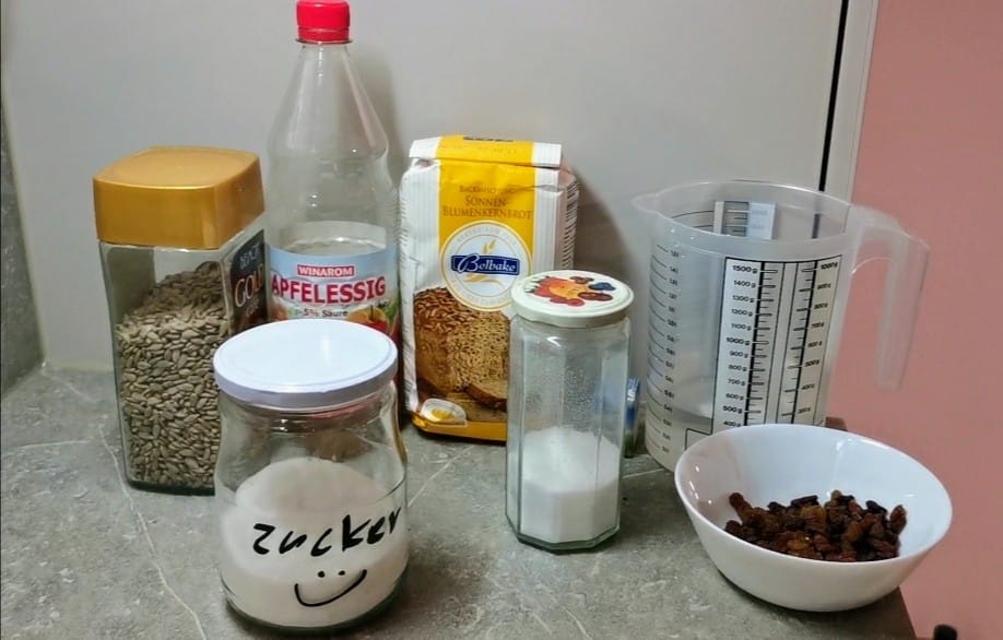 Das perfekte Brot wenn es mal schnell gehen muss – ohne Aufgehen und langem Warten: Zutaten mixen – in die Backform rein – 1h in den Ofen – FERTIG! Zutaten (für 1 Brot) 0,5 kg Dinkelmehl 2 TL Salz 2 EL Essig (Obstessig) 0,5 Würfel frischer Germ oder 1 Pckg. Trockenhefe (Germ = Hefe) 1 TL Honig 450ml handwarmes Wasser 150g Kerne und Nüsse nach Wahl (Leinsamen, Sesam, Walnüsse, Haselnüsse, Kürbiskerne, Sonnenblumenkerne,…) (Rosinen nach Belieben) etwas Butter/Öl zum einfetten der Kastenform. Ausserdem benötigst du eine Kastenaufflaufform und einen Mixer oder eine Küchenmaschine und mind.eine Rührschüssel. Zubereitung Handwarmes Wasser mit dem Honig und der Hefe verrühren, bis diese flüssig wird (bei frischer Hefe). Das Mehl mit dem Salz und den Körnern/Nüssen/Rosinen in eine Rührschüssel geben. Das Hefe-Honig-Wasser und den Essig dazugeben. Alles mit dem Rührgerät oder der Küchenmaschine kräftig durchkneten. Falls der Teig nicht richtig zäh ist – keine Angst! Das gehört so 😉 Den Teig in eine gefettete Kastenformen füllen und auf die mittlere Schiene in den KALTEN (Wichtig!) Ofen schieben. Bei 180-200 Grad ca. 1 Std. backen! Nach 10 min Backzeit einen Längsschnitt in das Brot machen und die Oberfläche mit Wasser bepinseln! AN GUATA! Zeitaufwand Gesamt: 1 Stunde 10 Minuten: 10 Minuten um die Zutaten zu mixen, 1 Stunde braucht das Brot im Backrohr zum backen. Tipp Stäbchenprobe machen: Mit der Stäbchenprobe kannst du testen, ob Kuchen, Muffins oder Brote fertig gebacken sind. Dafür wird mit einem Holzspiess oder Zahnstocher in die Mitte der Backware (Kuchen, Brot, Muffin) im Backofen gestochen. Wieder herausgezogen, darf kein flüssiger Teig mehr am Stäbchen kleben. Klebt noch etwas daran, die Backware wieder in den Ofen schieben – wenn nicht, ist das Gebackene fertig 🙂 Weitere ArtikelZopfbrotBuchteln mit VanillesauceHitzewelle - Do's & Dont'sKaiserschmarrnAmerikanische PancakesIn der Weihnachtsbäckerei Zuletzt aktualisiert: 09/2023