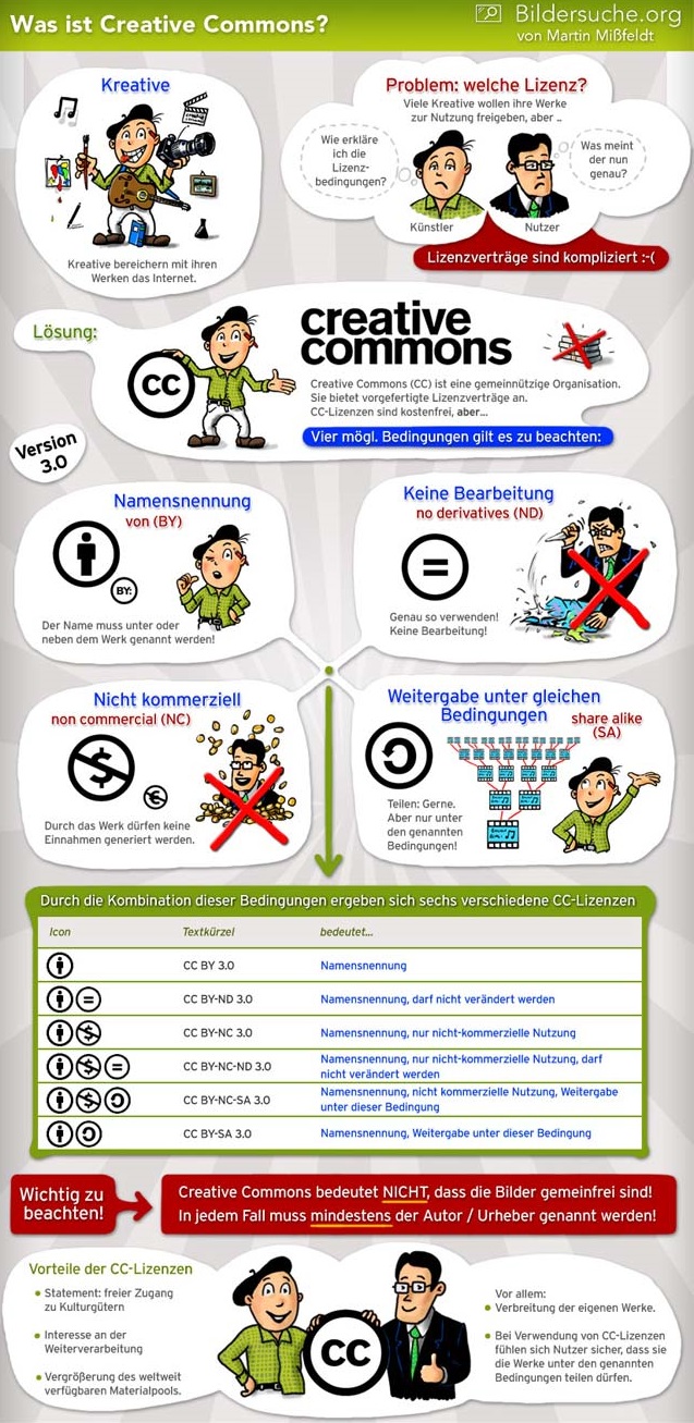 Wer Bilder oder Videos aus dem Internet verwendet, kann schnell Urheberrechte verletzen. Was ist erlaubt, was nicht? Was bedeutet CC-Lizenz und was mache ich, wenn ich eine Abmahnung erhalte? Diesen und weiteren Fragen gehen wir hier nach. Im Internet findet man heutzutage (fast) alles! Egal ob Musik, Videos, Informationen, Filme oder Bilder. Aber Achtung! Nicht alles, was du im Internet findest, darfst du auch (kostenfrei) nutzen oder weiterverbreiten. Wer sich nicht an die Bestimmungen der Urheberrechte hält, kann schnell eine teure Rechnung vom Anwalt im Briefkasten haben. Was genau ist das Urheberrecht? Du möchtest fremde Fotos, Grafiken, Videos oder Musikdateien im Internet veröffentlichen? Dazu brauchst du die Erlaubnis des Rechteinhabers oder der Rechteinhaberin! Es ist in aller Regel verboten, Bilder aus dem Netz herunterzuladen und ohne Nachfragen weiterzuverwenden. Achtung: Auch wenn du den Namen des Urhebers/der Urheberin angibst, heisst das nicht automatisch, dass du die Bilder, Videos … einfach so für deinen Blog, dein Insta Feed etc. verwenden darfst! Unter welchen Voraussetzungen darf ich fremde Werke verwenden? Grundsätzlich gilt, dass der/die Urheber*in (Person, die die Rechte an einem Bild, Video, Musikstück… hat) für die Verwendung des Werks zustimmen muss. Wenn man diese Zustimmung nicht hat, dürfen die Dateien nicht im Internet weiterverbreitet (z.Bsp. auf Sozialen Netzwerken teilen) oder benutzt (als Profilbild…) werden. Was allerdings erlaubt ist, ist die Nutzung im privaten Rahmen, sprich im Freundeskreis oder innerhalb der Familie. Aber Achtung: Was als privater Rahmen gilt, ist nicht immer klar. Wichtig: Es reicht nicht aus, unter einem fremden Bild einfach einen Copyright-Vermerkt © anzubringen oder den/die Urheber/in namentlich zu nennen! Sofern keine Zustimmung vorliegt, begeht man auch hier eine Urheberrechtsverletzung. Wie bekomme ich die Zustimmung des Urhebers/der Urheberin? Finde heraus, wer der/die Urheber*in ist oder die Verwertungsrechte besitzt (bspw. Fotograf*in selbst oder eine Fotoagentur wie shutterstock.com oder fotolia.com) Fotograf/in: Schreib ihm/ihr eine schriftliche Anfrage zur Fotonutzung. Neben der Höhe des Nutzungshonorars solltest du auch vereinbaren, in welcher Grösse bzw. Auflösung das Bild für welche Zwecke und wie lange genutzt werden darf und ob auch eine Bearbeitung des Fotos erlaubt ist. Fotoagentur: Das Bild kann in der Regel kostenpflichtig über die Plattform erworben werden. Auch hier lohnt es sich zu recherchieren, in welcher Grösse bzw. Auflösung du das Bild nach Bezahlung erhältst und ob eine Bearbeitung erlaubt ist. Was passiert, wenn ich das Urheberrecht verletzt habe? Wenn du das Urheberrecht verletzt, ist es sehr wahrscheinlich, dass dir eine Abmahnung ins Haus flattert. Das heisst du bekommst in der Regel einen Brief von einem Anwalt/der Anwältin im Namen des Rechteinhabers/der Rechteinhaberin (Fotograf/in; Fotoagentur, Künstler*in). Eine Abmahnung bedeutet nicht, dass du ein gerichtliches Verfahren am Hals hast. In der Regel wird zuerst versucht, die Sache aussergerichtlich zu klären. Meistens durch eine Schadensersatzzahlung an den Fotografen/die Fotografin oder Fotoagentur. Wichtig: Die Abmahnungen auf keinen Fall ignorieren! Ansonsten ist es wahrscheinlich, dass es zu einem Gerichtsverfahren kommt und du eine noch höhere Geldstrafe + Kosten für Anwälte bezahlen musst oder sogar eine Freiheitsstrafe von bis zu einem Jahr erhältst. Manchmal wirst du auch vorab per E-Mail kontaktiert und darüber informiert, was du tun kannst, um eine Klage vor Gericht abzuwenden. Solltest du eine Abmahnung erhalten, wende dich auf jeden Fall an einen Anwalt/eine Anwältin oder eine sonstig Beratungseinrichtung (wie das aha) und lass dich beraten. Oftmals sind die Schadenersatz-Forderungen nämlich masslos übertrieben – sprich, es wird unverhältnismässig sehr viel Geld gefordert. Ausserdem solltest du sicherstellen, dass es sich bei der E-Mail nicht um eine Abzocke von Internet-Kriminellen handelt. Wenn du Zweifel hast, ob die Abmahnung echt ist, wende dich an das aha, einen Anwalt/eine Anwältin oder eine andere Beratungsstelle, die sich mit dem Thema befasst. Damit du auf Nummer sichergehen kannst, solltest du bei der Verwendung von Bildern, Grafiken, Musik und Videos, die du nicht selbst produziert hast, auf Werke mit einer Creative Commons-Lizenz zurückgreifen. Diese darfst du unter bestimmten Bedingungen kostenlos nutzen. Creative Commons-Lizenz (CC) Normalerweise sind, wie du weisst, alle kreativen Werke durch das Urheberrecht geschützt. Doch manche Künstler*innen geben uns die Möglichkeit, ihre Werke (Musik, Videos, Bilder, Texte…) unter bestimmten Bedingungen kostenfrei verwenden zu können, ohne dass du sie um Erlaubnis fragen musst. Normalerweise sind Lizenzverträge eine komplizierte Sache. Die gemeinnützige Organisation Creative Commons („schöpferisches Gemeingut“) ermöglicht es aber, dass Urheber*innen aus einem Baukasten die passendste Creative Commons-Lizenz auswählen kann, um das kostenlose Kopieren, Teilen und Benutzen des Werkes für private bzw. nicht-kommerzielle Zwecke möglich zu machen. Wichtig: CC-Lizenzen ersetzen nicht das Urheberrecht – sie ermöglichen aber die (kostenlose) Nutzung von Inhalten unter Einhaltung der Bedingungen des Urhebers/der Urheberin. Wie bereits oben erwähnt gibt es unterschiedliche Lizenzen, die sich aus 4 Lizenz-Bestandteilen kombinieren lassen: CC BY: Namensnennung CC BY-SA: Namensnennung – Weitergabe unter gleichen Bedingungen CC BY-ND Namensnennung – keine Bearbeitung CC0 Public Domain (öffentliches Gemeingut) In der folgenden Grafik sind die Bestandteile noch einmal vereinfacht erklärt: Infografik-bearbeitet: „Creative Commons – Was ist und bedeutet das?“ (von Martin Mißfeldt / Bildersuche.org) Wie zitiere ich CC-Inhalte richtig? Wie du jetzt vielleicht gelernt hast, musst du bei der Nutzung von Bildern, Videos oder 